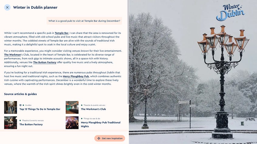 Moving beyond traditional navigation and filtering methods, the AI Short Break Planner also delivers more personalised responses. Plus, because the content comes directly from Visit Dublin's site, users can trust the information received.
